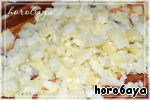 Картофель, яйца и морковь отварить до готовности. Картофель почистить, нарезать кубиками или же просто порубить ножом (что я и сделала :)).