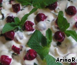 Поливаем полученным соусом салат, посыпаем (украшаем) листиками мяты и вишней.