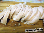 Куриное филе отвариваем в подсоленной воде до готовности. Охлаждаем и нарезаем тонкими ломтиками поперек волокон.