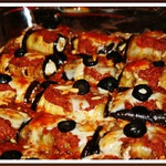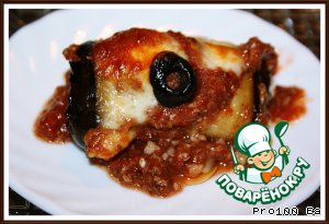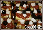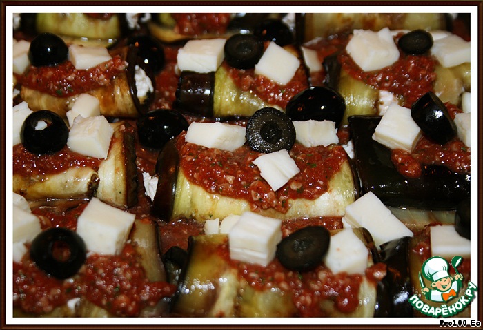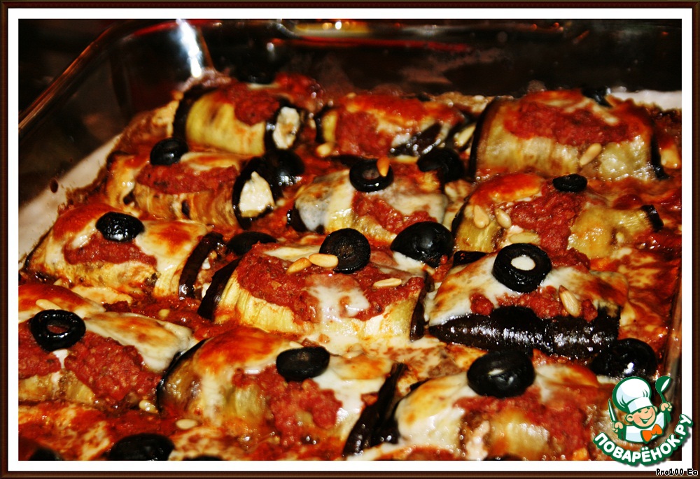 9. На баклажаны выкладываем мoццареллу, кедровые орешки и маслины (дольки).