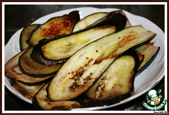 1. Баклажаны помыть и нарезать в длину 0.5 см. Обжарить 2 минуты на каждой стороне пластинки.