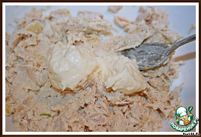 2. Куриное мясо нарезать мелкой соломкой, добавить измельчённый чеснок и майонез, соль и черный перец по желанию. Всё перемешать.