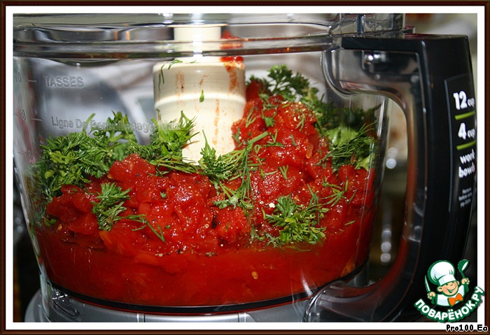 3. В кухонном комбайне или в блендере соединить помидоры вместе с соком и зелень, измельчить.