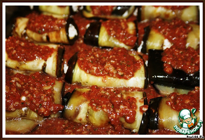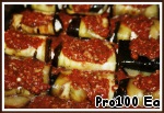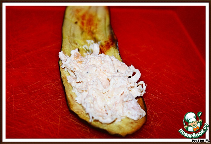 6. Начинить баклажаны куриной смесью и завернуть в рулетик.