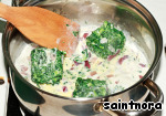 Масло сливочное или маргарин растопить в кастрюле, добавить мелко нарезанный лук, жарить до прозрачности, затем добавить шпинат, залить молоком и сливками (молоко наливала "на глаз", чуть больше, чем на половину покрывало шпинат), посолить, мешать, пока не разморозится шпинат, по желанию - добавить специи (орегано, "весенняя смесь".