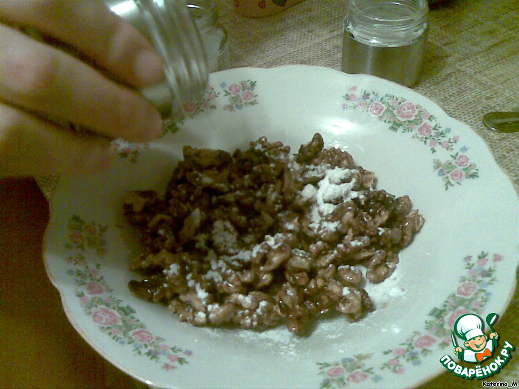 Затем высыпаем наши орехи в тарелку (или еще какую-нибудь посудину), главное, чтобы она была плоской. Посыпаем сверху сахарной пудрой и молотой корицей, чтобы на каждый орешек попало.
