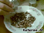 Берем 100 грамм очищенных грецких орехов, заливаем кипятком и оставляем минуты на 3-4, затем сливаем воду и даем орехам немножко подсохнуть.