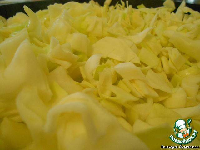 Для начала нужно нашинковать капусту и лук, всё это потушить на сковородке в небольшом количестве масла. В капусту добавить порезанные вареные яйца, соевый соус, немного соли (по вкусу) и черный молотый перец. Пока капуста будет остывать, в миксере делаем тесто.