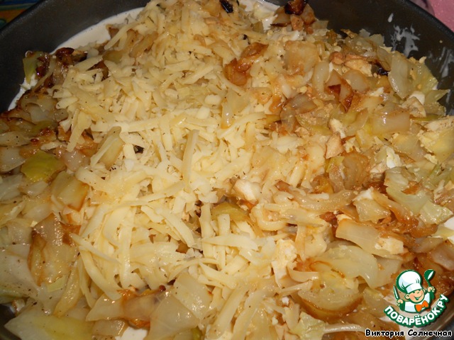 На тесто высыпаем остывшую начинку и сверху тертый сыр.