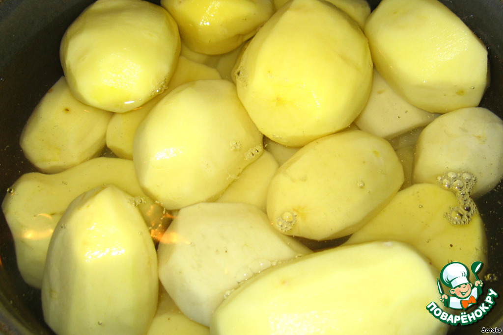 Картофель очистить и отварить до готовности в подсоленной воде.