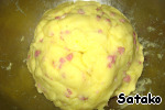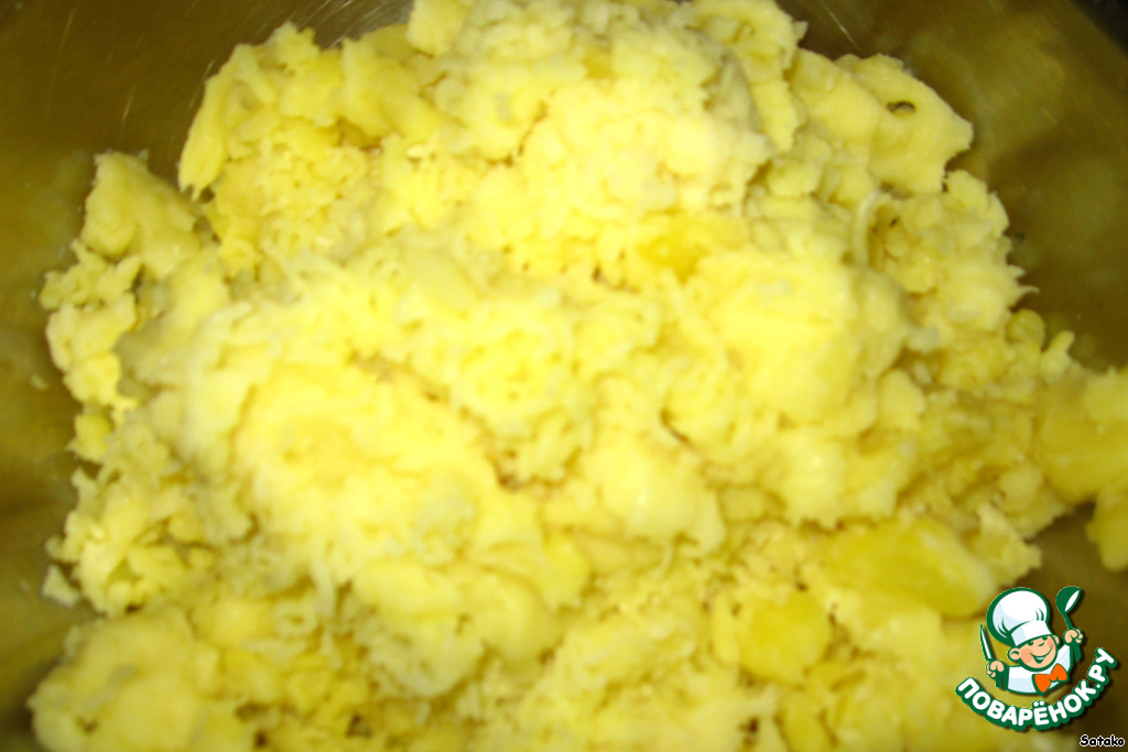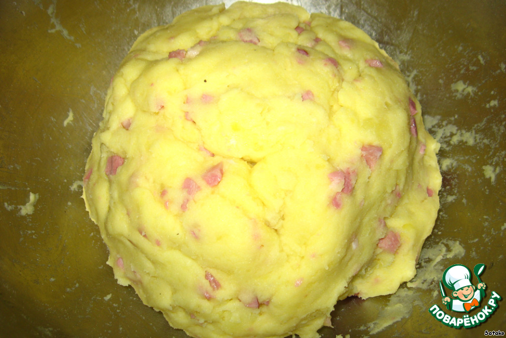 Готовый картофель, пока он горячий!!! протереть на тёрке для пюре (так делаю я), добавить к ветчине, желткам и муке.