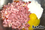 Пока картофель варится, нарезать ветчину кубиками, добавить к ней 1 ложку муки и 2 яичных желтка.