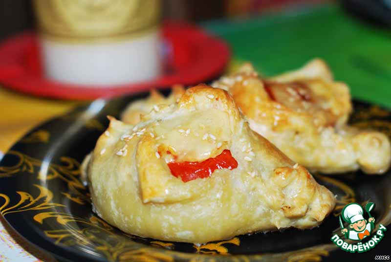 Тесто разморозить. Раскатать так, чтобы стало в два раза длиннее прежнего. Разрезать на квадраты.