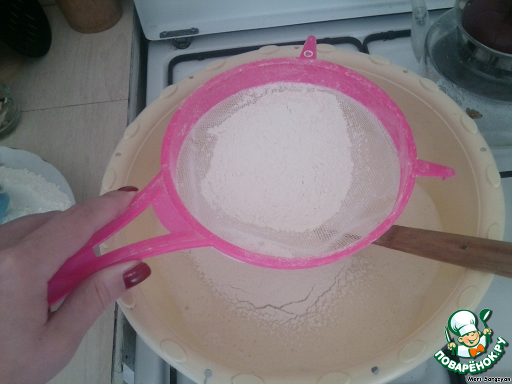 Хорошо перемешать 20 мин. Добавить 3 стак. муки, перемешать и снять с пара.