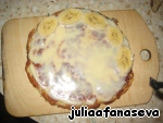 Остывшие кожи смазать кремом. Между коржами уложить дольки банана.
