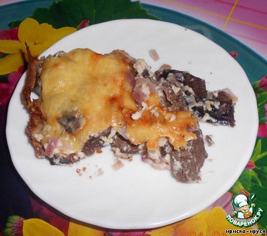 Мясо отварить, порезать ломтиками поперек волокон. Выложить в форму для запекания.