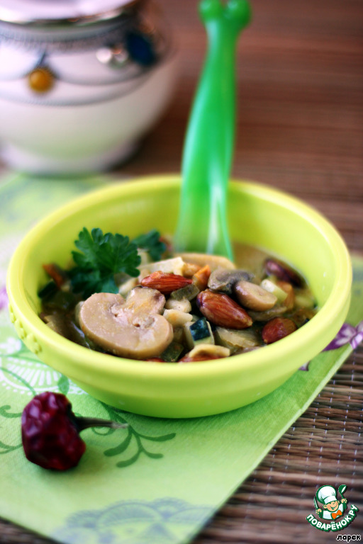 Ароматное овощное рагу из Юго-Восточной Азии. Возможно как самостоятельное блюдо или гарнир. Является отличным дополнением к рису. Вся «изюминка» вкуса в наборе специй (не рекомендую использовать приправу карри «из пакетика»). Кстати, орехи можно использовать любые, так же, как и любую смесь овощей.