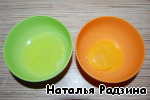 Яйцо разделить на белок и желток, в белок добавить щепотку соли и немного взбить, в желток добавить немного сахара и хорошо перемешать.