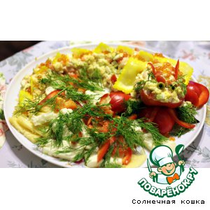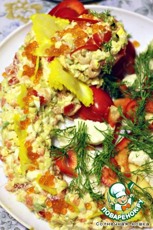 Украсить: сделать мордочку и лапы из болгарского перца, по хребту пустить "шипы" из корейской капусты, посыпать красной икрой.