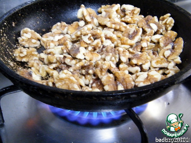 Так как торт, в принципе, ореховый, с них и начнем наш рассказ: на сухой сковороде подсушим хорошо орешки, они, в принципе, и так сухие, но я так привык,