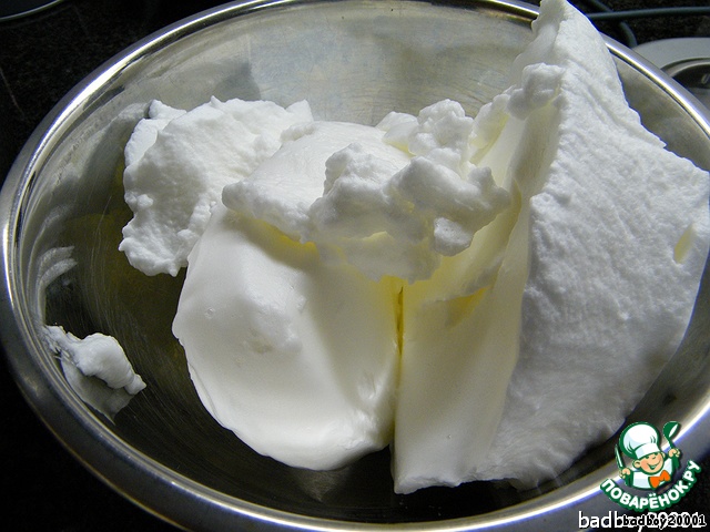 к ним, просто не взобьются, так что начнем с них, пока чистая и сухая посуда, взбиваем белки с щепоткой соли в крепкую пену и откладываем в отдельную емкость.