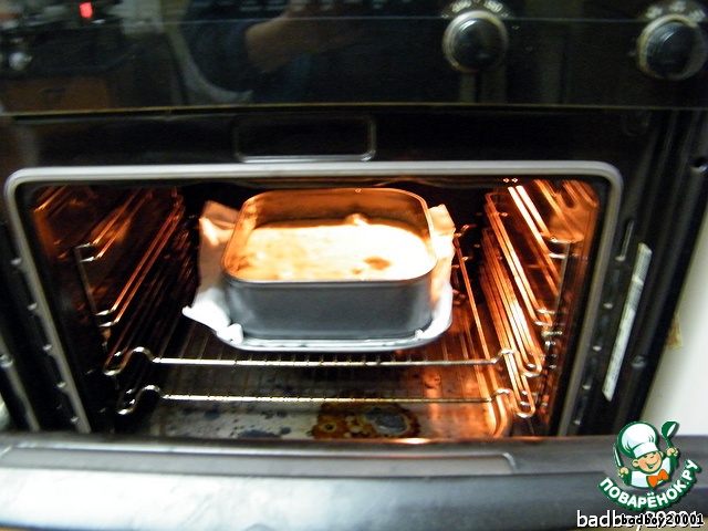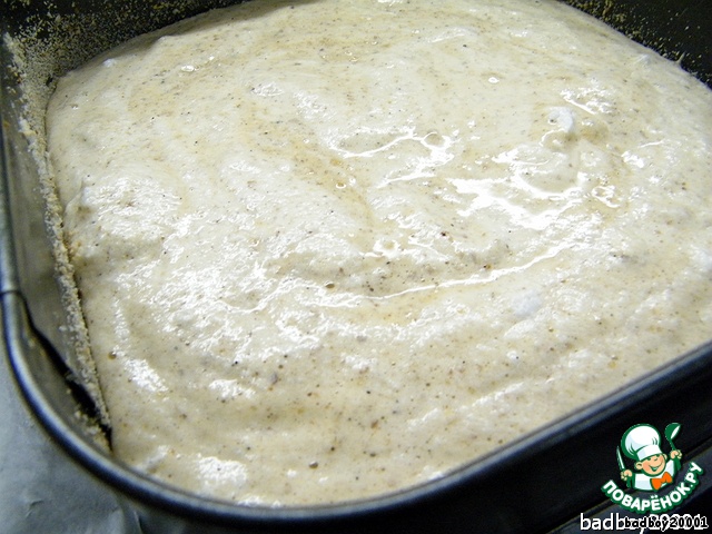 Форма, как обычно, ждет своего часа, уже застелена бумагой, бумага смазана маслом и присыпана сухарями, выливаем в это приспособление все тесто,