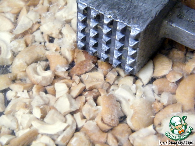Теперь пришла очередь до орешков кешью (люблю я их очень), прямо так в кулечке, без фанатизма, молоточком для отбивания мяса или уже на безвыходный конец скалкой, ну и уже совсем грубо бутылкой от шампанского, стараясь расколоть, а не