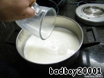 Корж в духовке, и вы подумали, что можно уже расслабиться, почитать любимый любовный роман, но нам надо идти дальше, а дальше наш ждет крем, значит, ставим молоко в кастрюльке на огонь и добавляем ложку муки, варим, постоянно помешивая, пока жидкость не начнет густеть, сильно заваривать нет надобности, когда остынет, станет еще гуще.