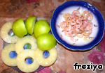 • Яблоки и ананасы режем кубиками. Желательно средней величины, небольшими и не слишком мелкими кусочками