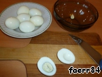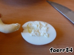 Теперь займемся начинкой: разрезаем яйца и вынимаем желток,
