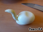 и фаршируем яйца, делаем надрез, чтобы закрепить лебединую шейку,