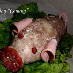 Из колбасы сделать ушки и пятачок. А глаза - из черного перца горошком или бутонов гвоздики. -