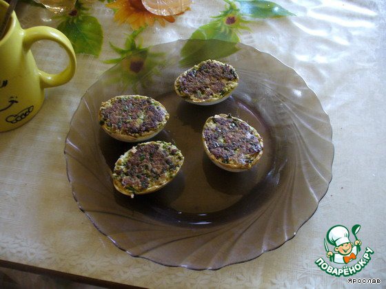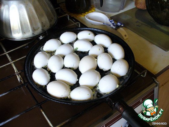 На сковороде разогреваем сливочное масло и кладем яйца фаршем вниз. Жарим 7 мин. на небольшом огне.