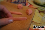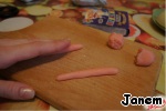 Разделяем массу на шесть кусочков: один большой (для ленточки), два поменьше (для петель банта), два еще меньше (для ленточек банта) и один совсем маленький (для узелка). Делаем из них колбаски.