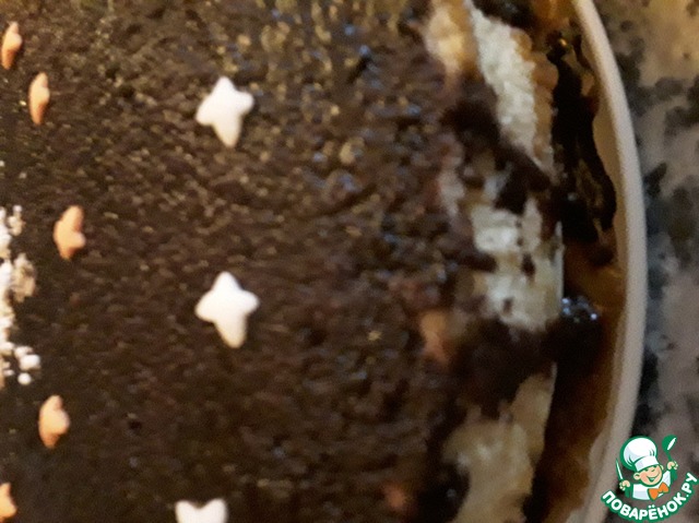 Один корж положить на дно разъемной формы, вылить половину суфле,
