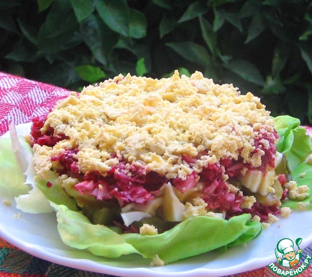 На блюдо выкладываем 1/2 часть мяса со свеклой.