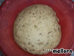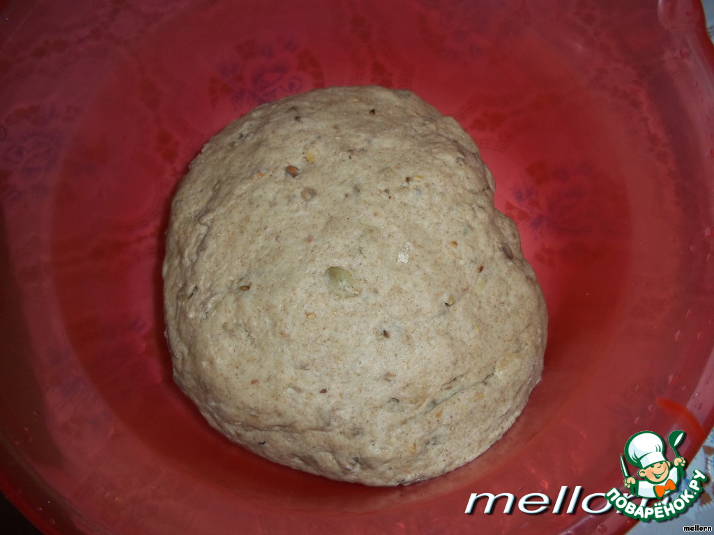 Замесить тесто из рассола, растительного масла, соли, дрожжей, семечек и муки. Тесто будет слегка «прилипать» к рукам. -
