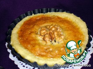 Заливаем яичной смесью. Раскладываем красивые половинки орехов. Отправляем в разогретую на 180 градусов духовку на 20 минут.