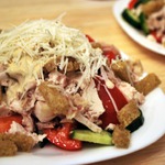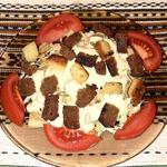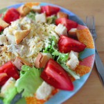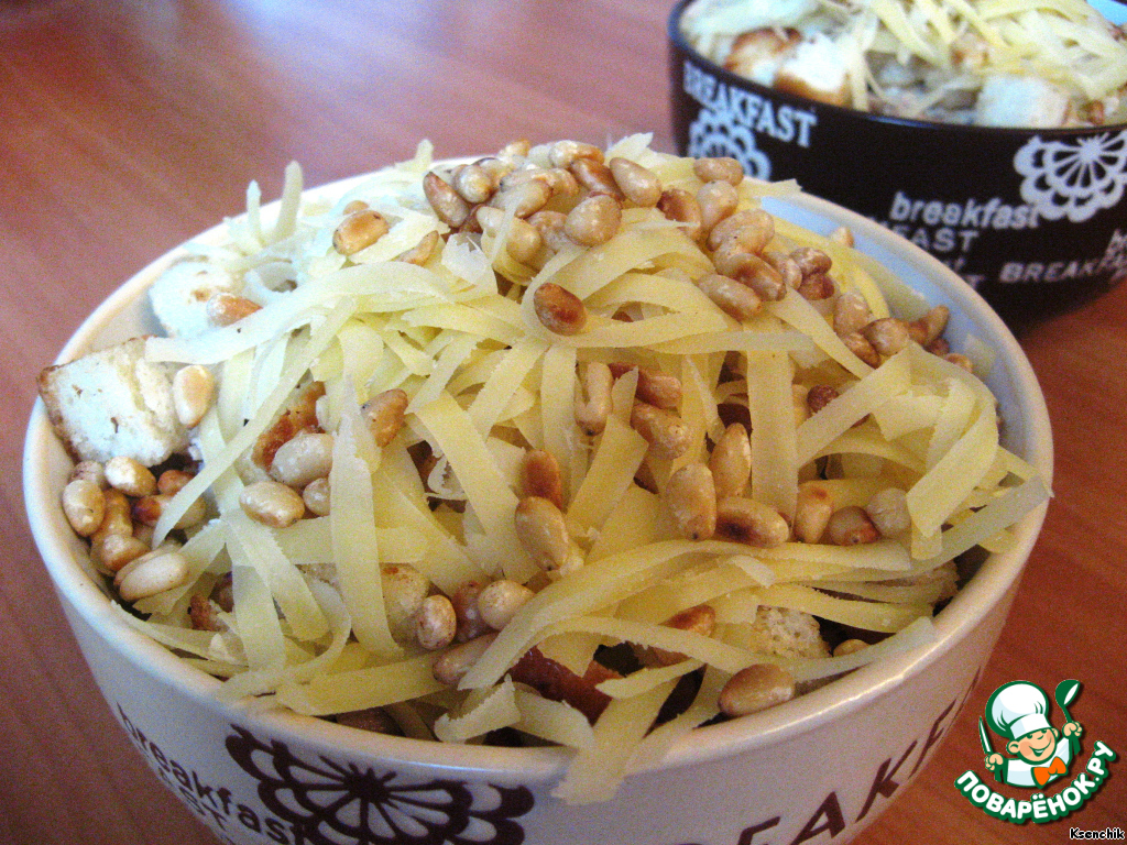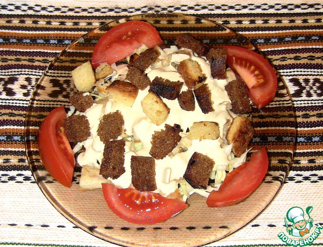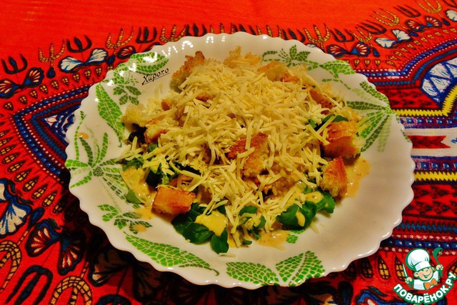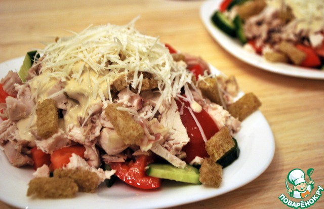 Это очень вкусный салат. Кому-то он запросто заменит второе блюдо. Чем-то напоминает «Цезарь».