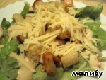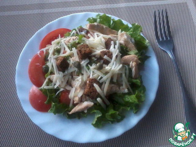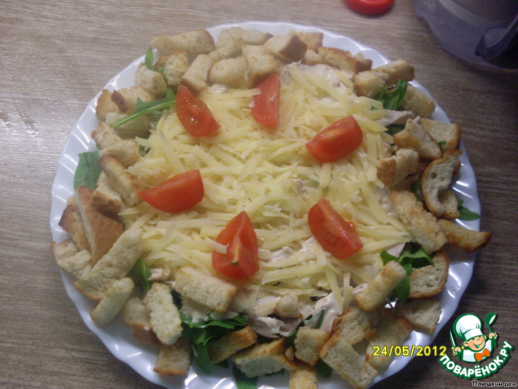Кто-то скажет: «Это же Цезарь!» - и ошибется, рецепт куриного салата с соусом «Цезарь» совсем другой. Мне его прислала моя новая подруга, а ей подарил шеф-повар какого-то ресторана. Соус другой, курица жареная и т. д. Уверена, что он вкуснее моего, но этот вариант мне легче приготовить, т. к. отварная курица у меня есть почти всегда, а рукколу я обожаю и тоже часто покупаю.
