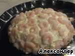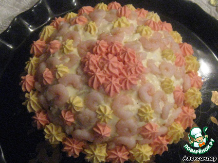 Перечисленные ингредиенты соединяем с креветками (грамм 50 оставляем для украшения). Добавляем майонез и сметану, соль и перец.