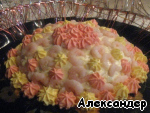 Густой пастообразный творог делим на две части. В одну добавляем протертые желтки. Во вторую - микс из свекольного и морковного соков с добавлением загустителя. "Рисуем" розочки. Это совсем несложно.