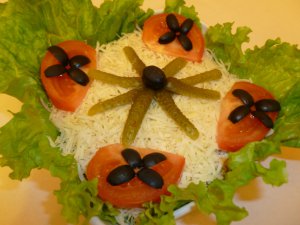 Выкладываем на листья салата, посыпаем тертым сыром, украшаем помидорами, корнишонами и оливками.
