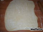 Стол обсыпать немного мукой и раскатать первый пласт. Его смазать размягченным маслом, масло должно быть мягким, но не растопленным.