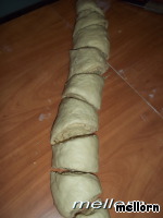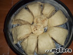 Форму щедро смазать оставшимся маслом. Выложить треугольники по кругу, а крайние обрезки - в середину (обрезки слегка надрезать крест-накрест).