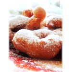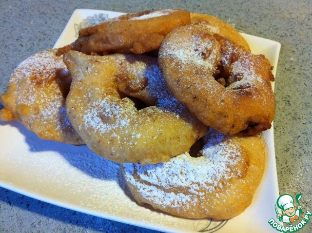 Отдельно в небольшой посуде разводим крахмал в двух столовых ложках сока (или сиропа от ананасов). Остальной сок доводим до кипения (предварительно попробуйте, если вам кажется недостаточно сладким, добавьте сахар по вкусу). Когда сок закипел, вводим крахмал и немного кипятим, пока сок не превратится в кисель. Готовые колечки можно полить этим киселем или посыпать сахарной пудрой. -