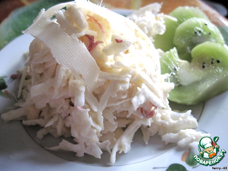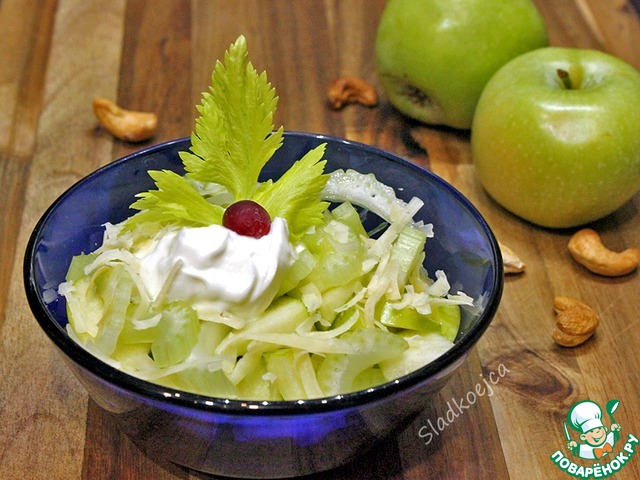 Прекрасный салат, превосходный! Мне кажется, даже нелюбители сельдерея будут с удовольствием есть этот салат. Очень вкусный и сочный! Яблоко и сельдерей я нарезала, а сыр измельчила на терке. Заправила йогуртом. За рецепт спасибо, автор!
