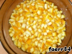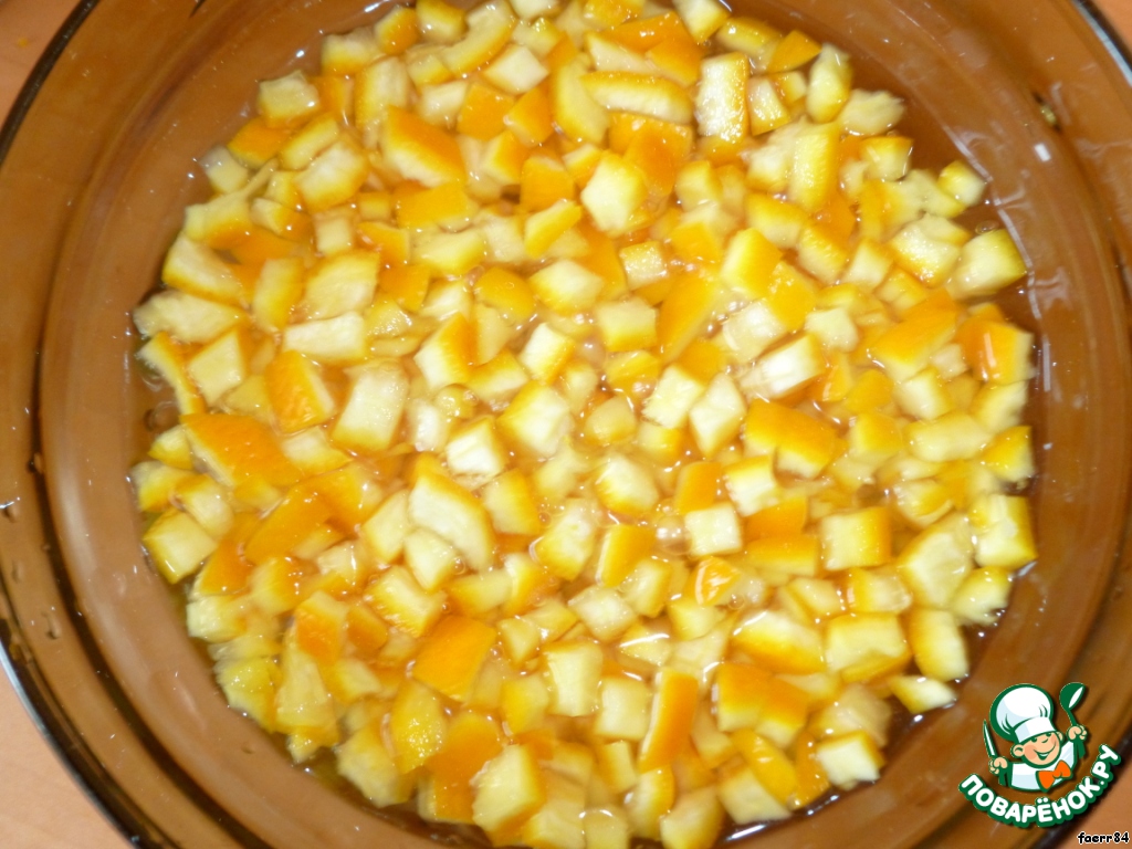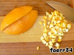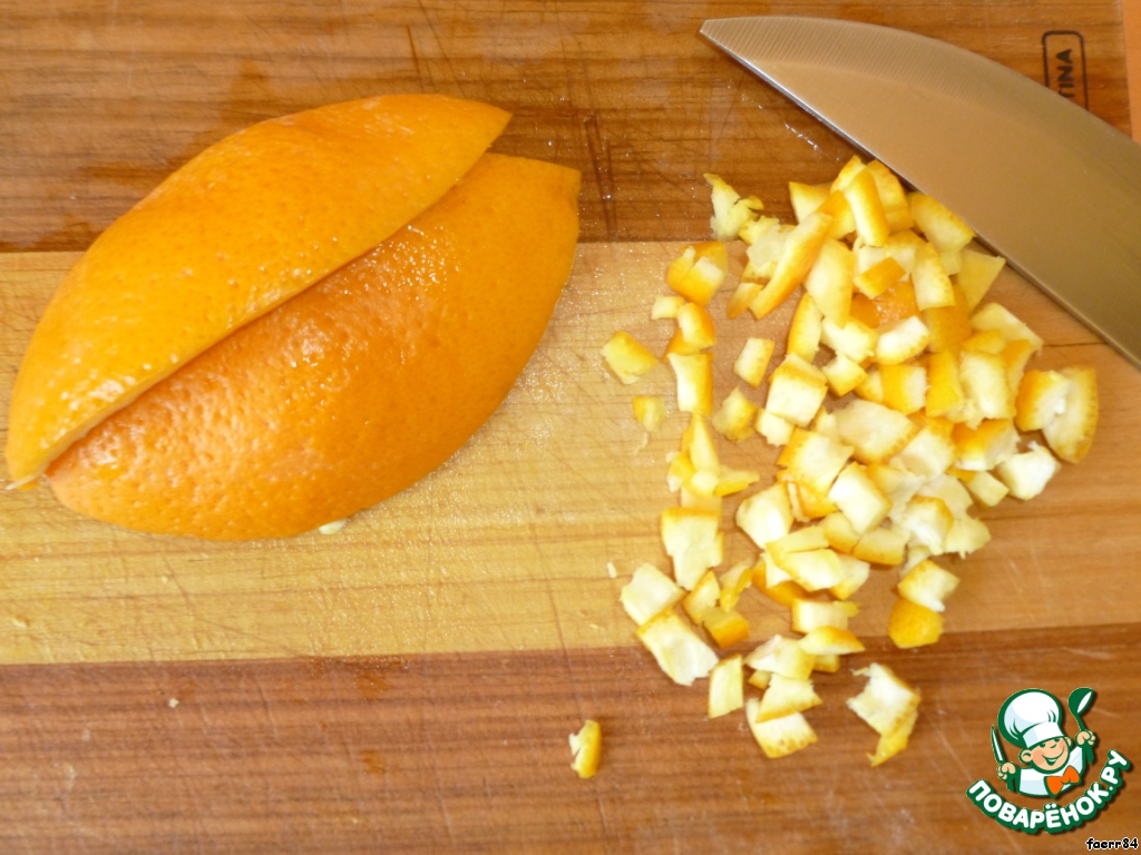 Для начала займемся начинкой: снимаем кожуру с апельсина и очень мелко нарезаем,