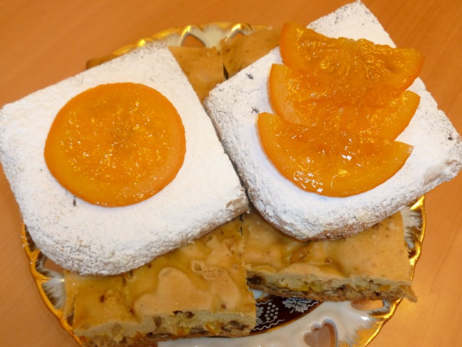 посыпаем измельченными орехами и апельсиновыми шкурками (шкурки по возможности отжать),