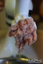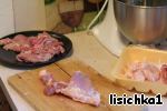 Куриное мясо отделить от костей. Для фарша использовать не только куриное мясо, но и кожу.